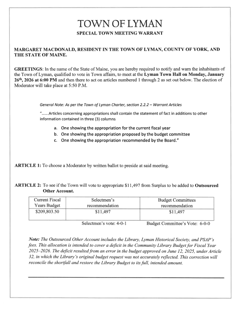 Public Hearing will be held on January 12, 2026 at 6:00pm at the Town Hall